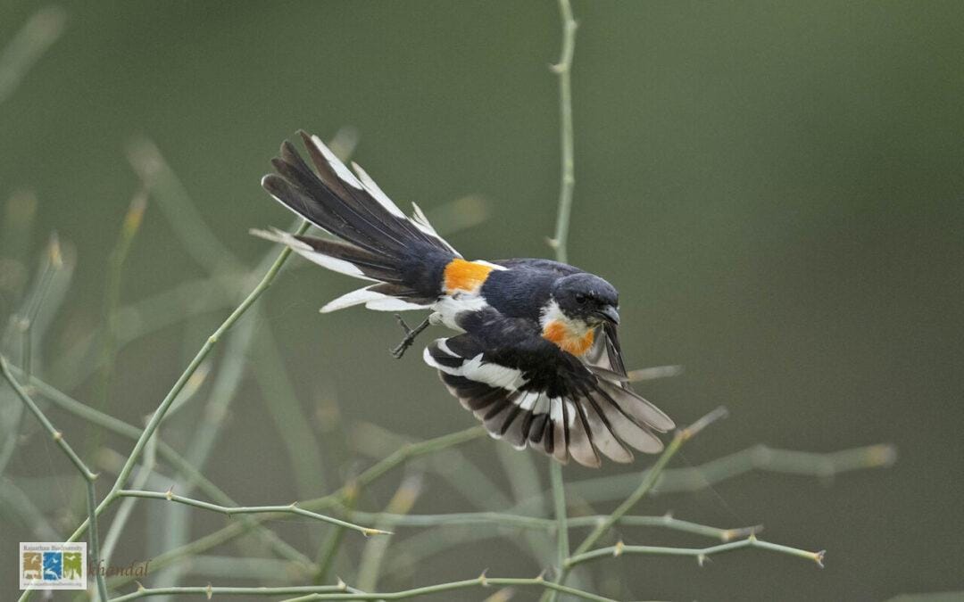 इसी प्रकार के व्यवहार का प्रदर्शन वाइट बेलिड मिनिवेट (white-bellied minivet) नामक पक्षी अत्यंत शानदार एवं नाज़ुक तरीके से करता है। White-bellied Minivet (Pericrocotus erythropygius) भारत में मिलने वाला एक स्थानिक पक्षी है, जो शायद किसी अन्य देश में नहीं मिलता (कुछ लोग मानते है की यह नेपाल में भी मिलता है)। झाड़ीदार और सवाना वनों में रहने वाला यह एक सुंदर मिनीवेट है। जिसमें नर का ऊपरी शरीर, चेहरा और गर्दन का हिस्सा चमकदार काला होता है। छाती पर एक गोल नारंगी पैच होता है, बाकी के अंदरूनी हिस्से सफेद होते हैं। पूंछ काली है, जिसके ऊपर का हिस्सा नारंगी होता है और पंखों पर सफेद निशान हैं। परन्तु मादा इतनी प्रभावी नहीं दिखती है, उसके पीठ का ऊपरी भाग गहरे भूरे रंग का, हल्के काले पंख, एक काली पूंछ होती है। पंखों में नर के समान सफेद निशान होते हैं, और पूंछ का ऊपरी हिस्सा हल्का नारंगी होता है।